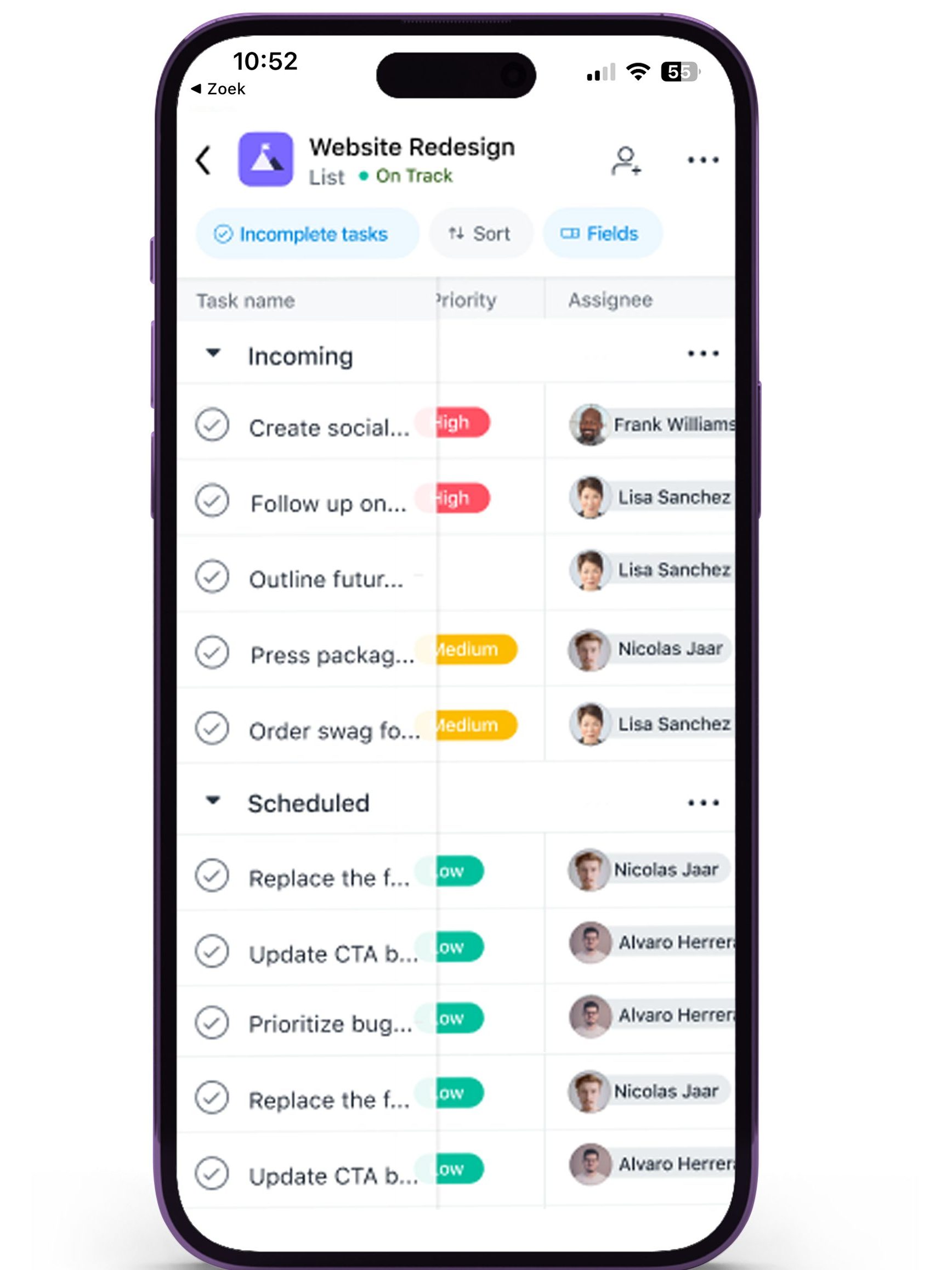 Log in in de onlineversie van Nozbe in je webbrowser of in de Nozbe-app op je telefoon. Maak een takenlijst aan en geef per taak aan hoe belangrijk hij is. Geef elke taak een deadline en ga aan de slag. Alleen of met je collega’s.