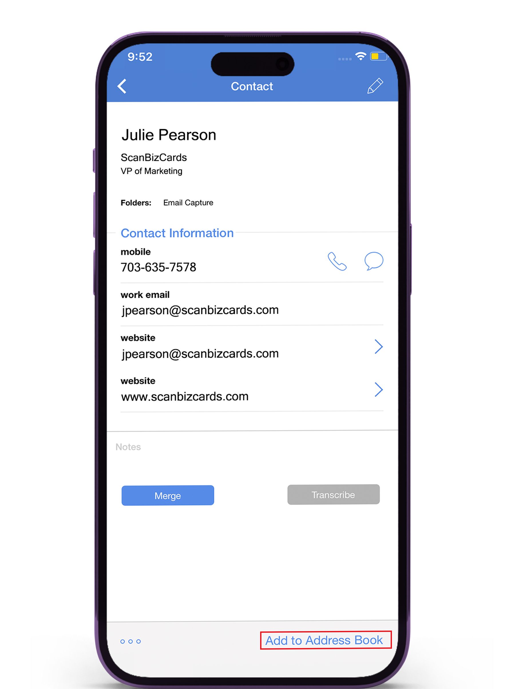 Alle visitekaartjes die je scant komen samen in een overzicht in ScanBizCards te staan. Maar je kan ze ook contacten in je telefoonboek. Heb je ze altijd bij de hand.