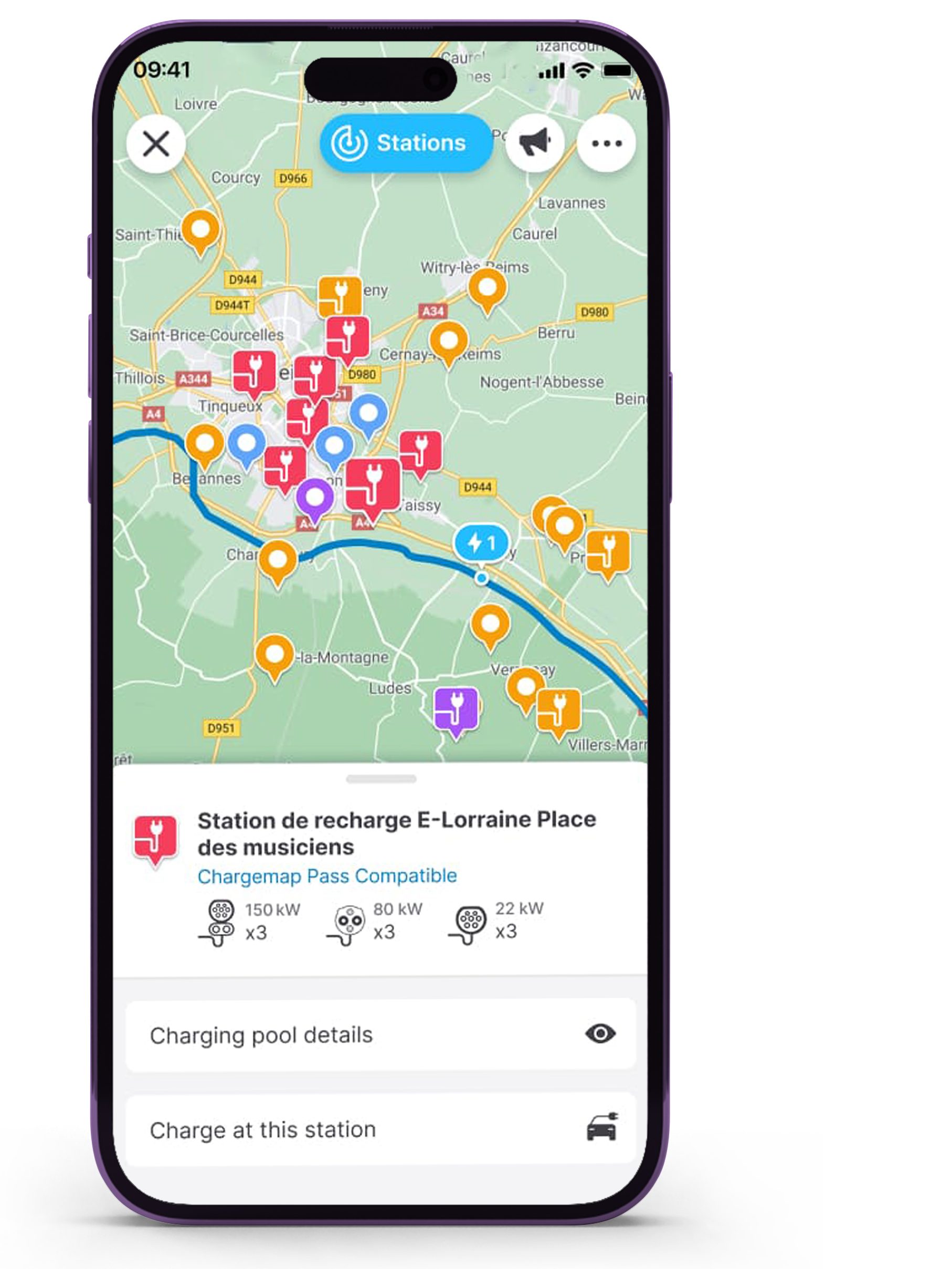 Een routeplanner–app die je helpt bij het vinden van laadpalen voor je elektrische auto. In bijna alle Europese landen.