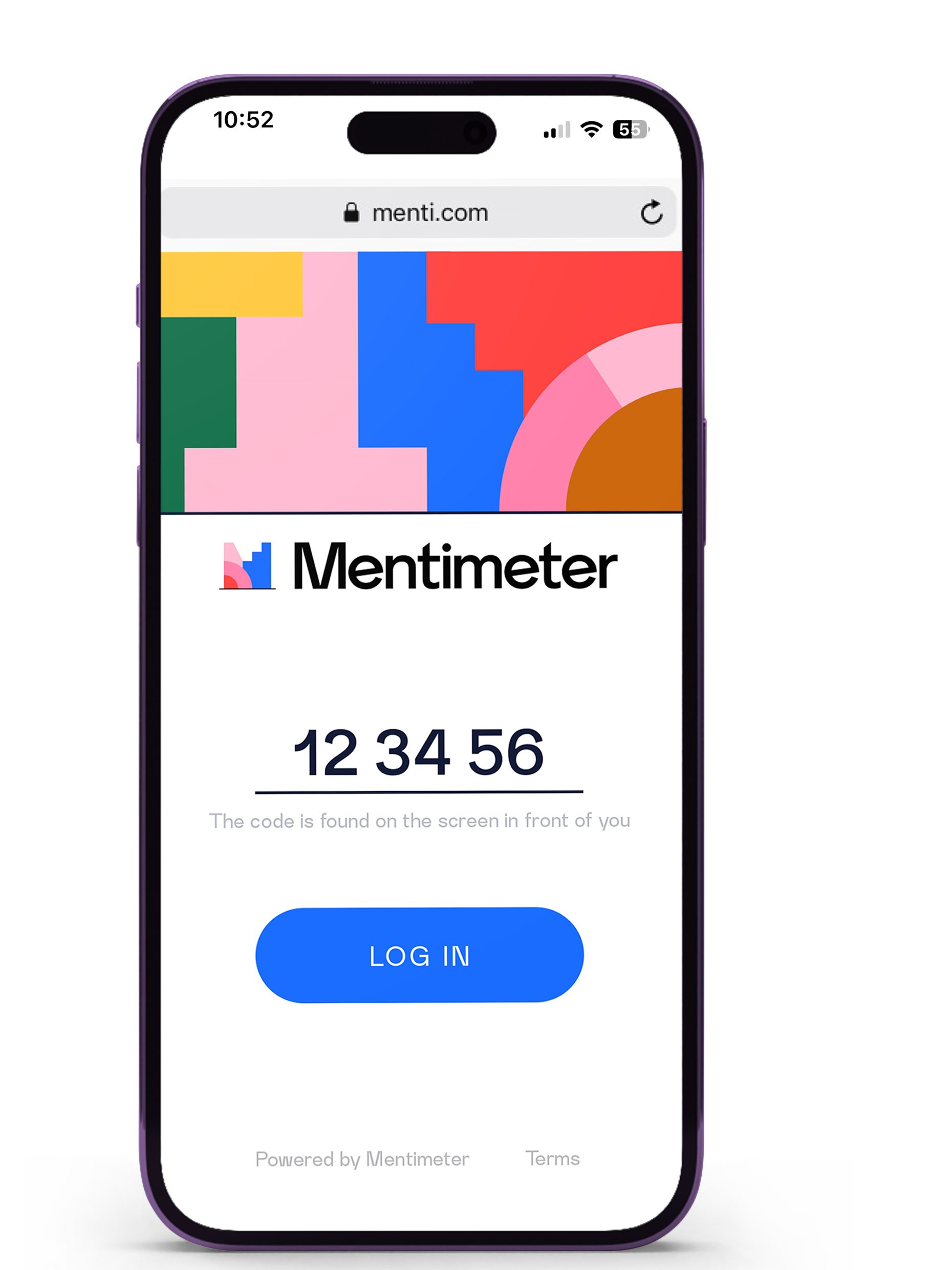 Nadat je een presentatie hebt gemaakt, maakt Mentimeter een unieke code aan. Die geef je aan iedereen die je presentatie volgt. Met de code loggen deelnemers in op menti.com. Kan gewoon zonder account. Ze komen meteen in je presentatie.