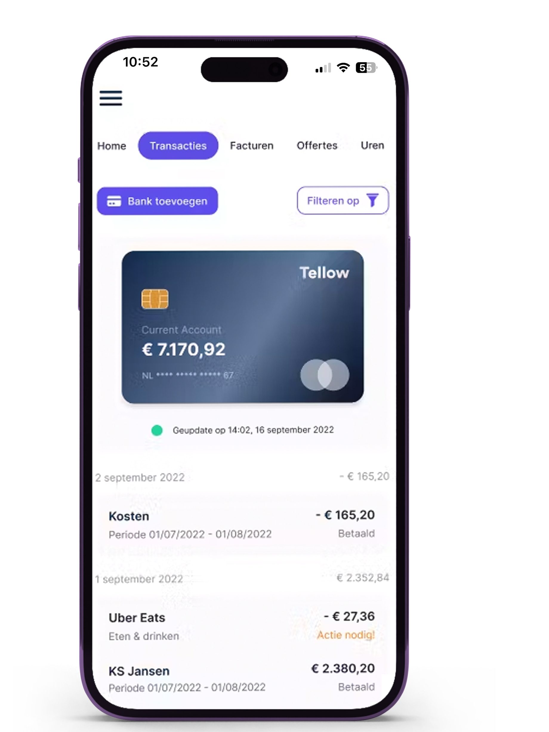 Koppel Tellow aan je bank. Worden al je betalingen automatisch in je boekhouding gezet. Echt handig. Tellow maakt boekhouden een stuk makkelijker.