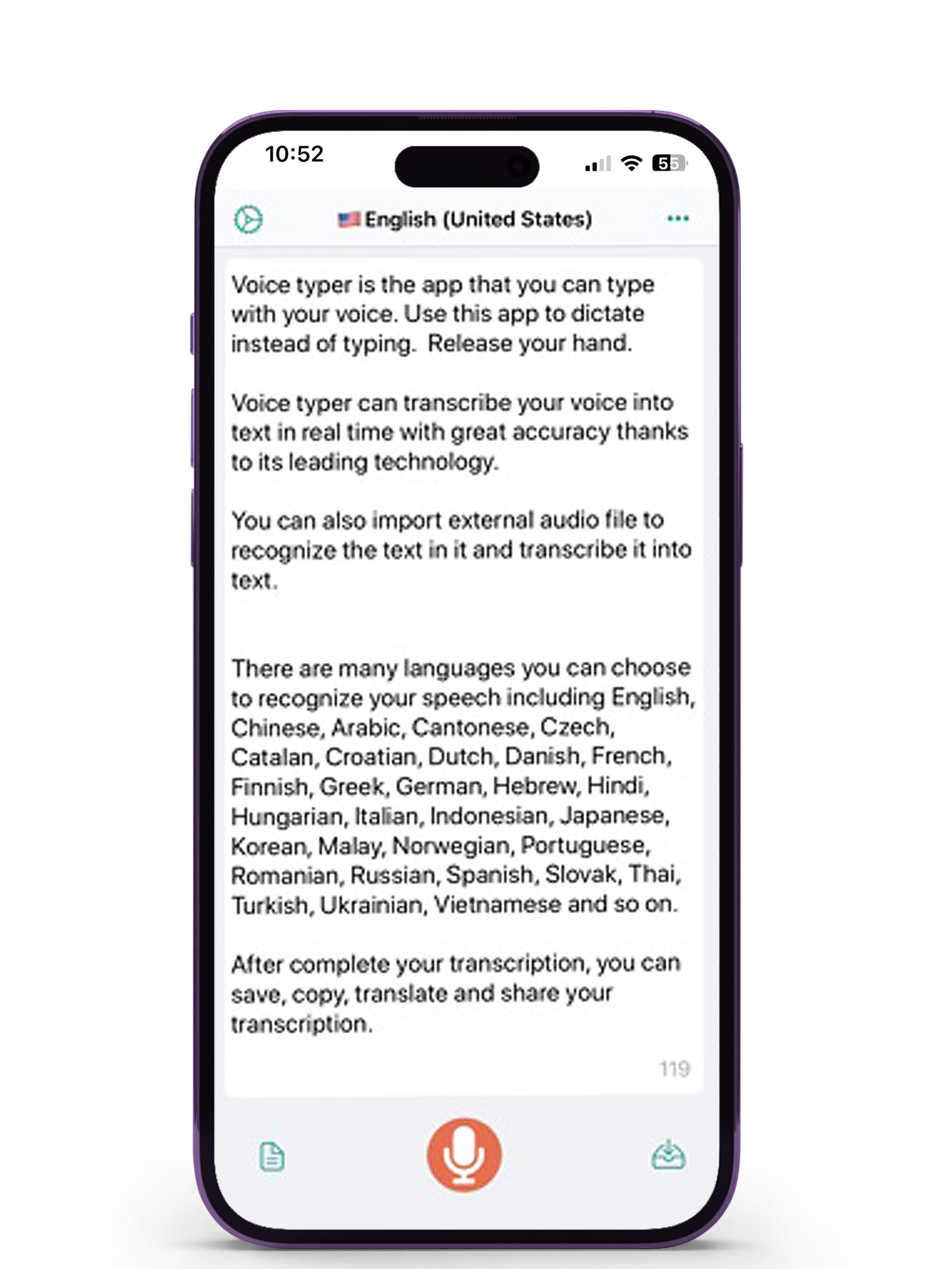 Zet spraakmemo’s om in geschreven tekst. Dicteer de tekst die je op papier wil hebben of gebruik deze app voor het transcriberen van opgenomen interviews.