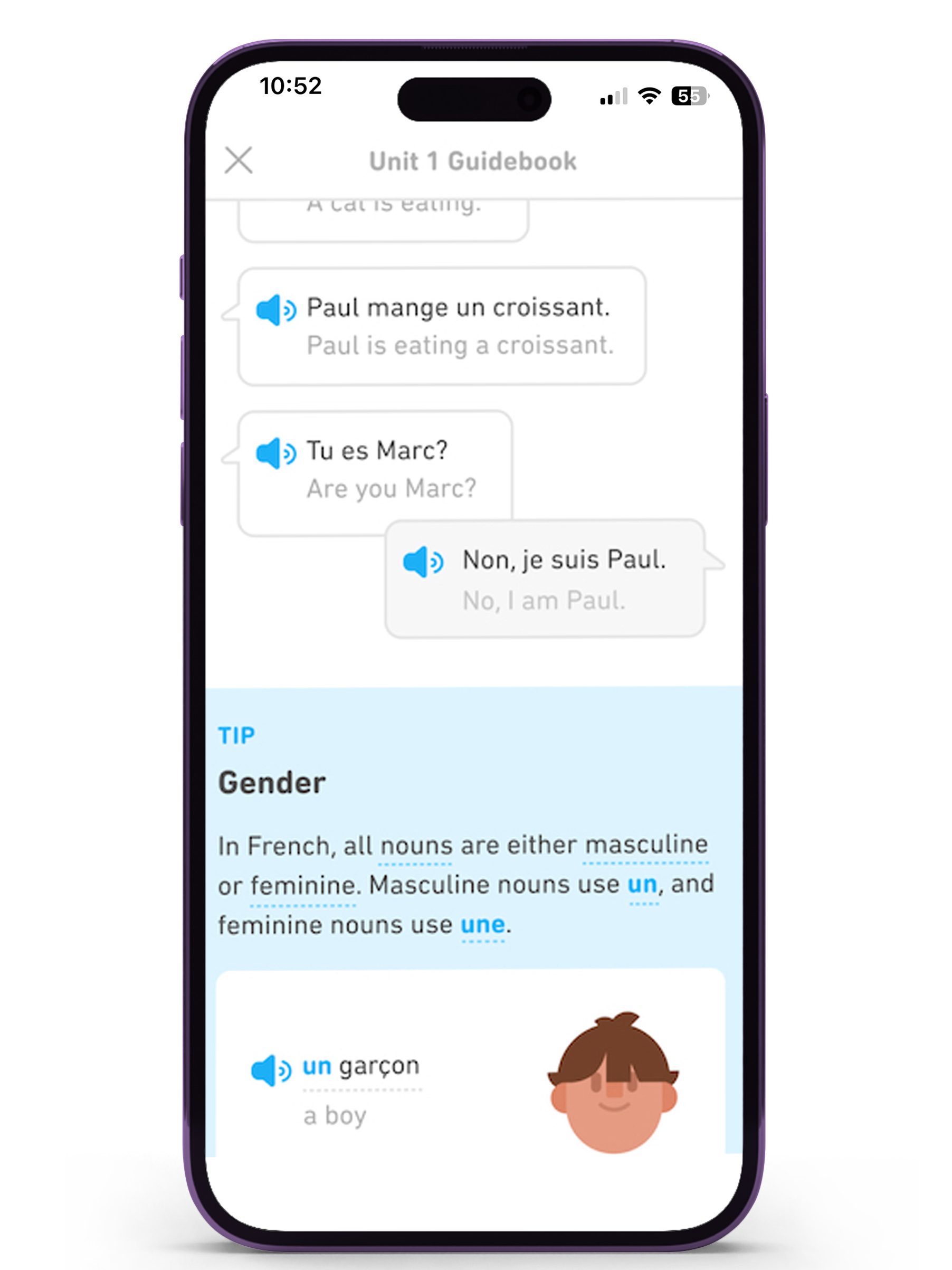 Open de app, kies de taal die je wil leren en kies je instapniveau: beginner (ik wil bij de basis beginnen) of gevorderde (de basis ken ik al, ik wil mijn kennis graag verdiepen). Weet je niet wat je instapniveau is? Doe de taaltest. Zoekt Duolingo het voor je uit.