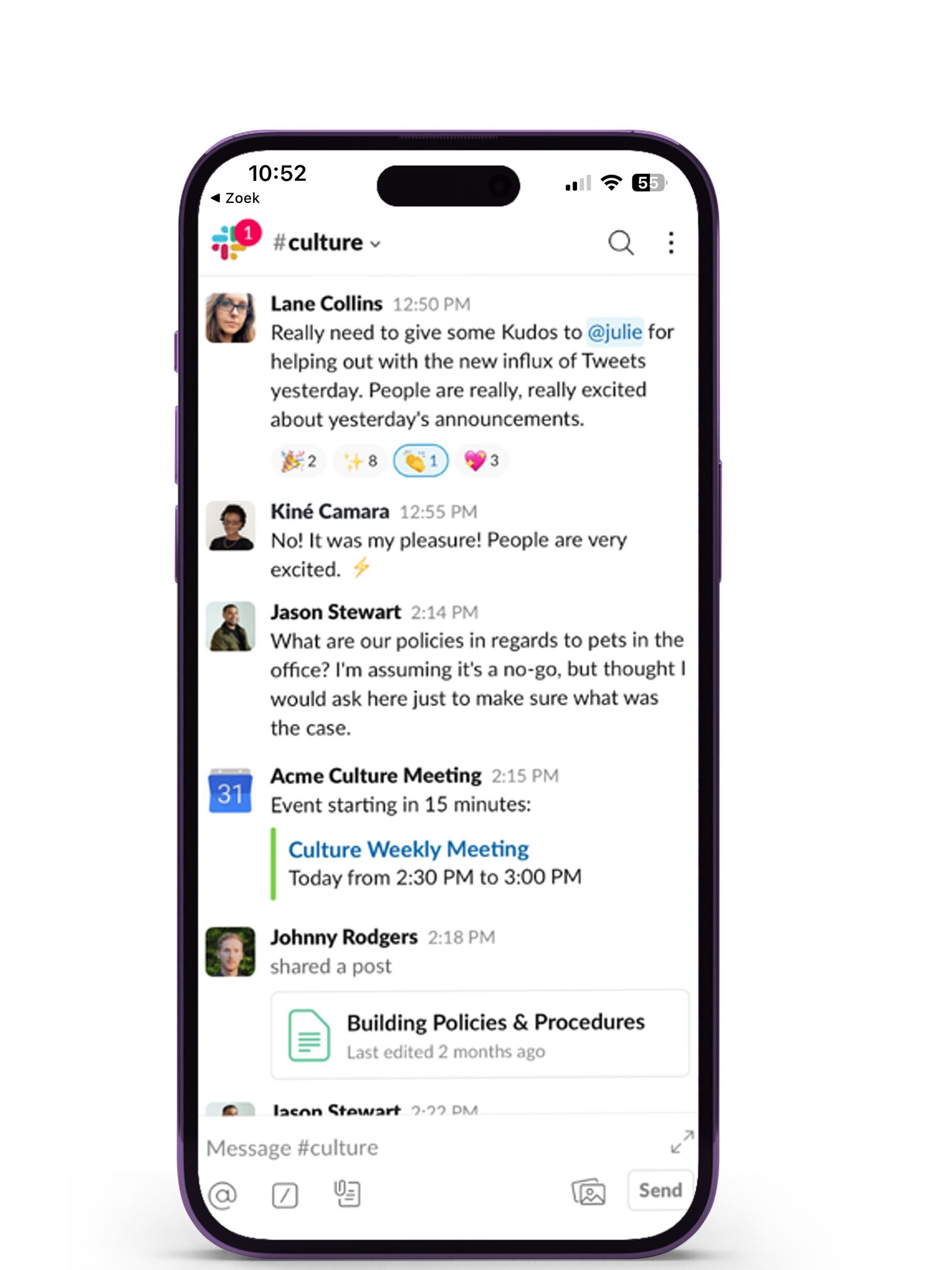 In Slack maak je kanalen aan. Vergelijk ze maar met de chatrooms van vroeger. Maak een openbaar kanaal waar iedereen aan kan deelnemen. Of een privékanaal waar je alleen in kan als je wordt uitgenodigd. Snel antwoord nodig? Stuur iemand een privébericht of (video)bel met elkaar.